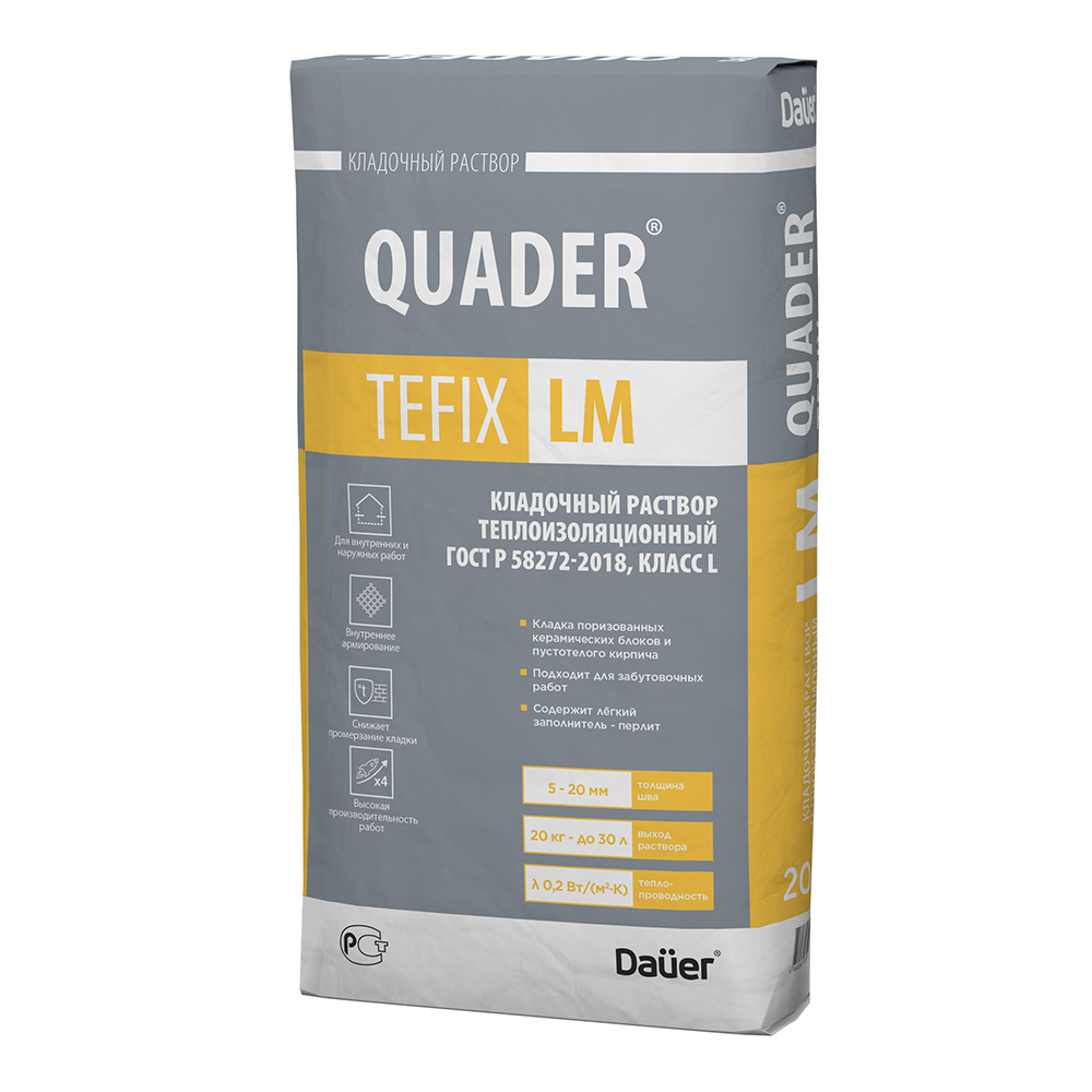 ПОДГОТОВКА ОСНОВАНИЯ Стеновые материалы и основание должны быть ровными, прочными, недеформирующимися, поверхность блоков обеспылена. Для монтажа кладки с основания необходимо удалить высолы, осыпающиеся элементы, старые покрытия, мастики, продукты коррозии металла и другие загрязнения, препятствующие сцеплению материала. Основание необходимо обработать соответствующим грунтом серии IMMER® MADE. На неравномерно и сильно впитывающие влагу основания нанести грунт в несколько слоёв. Дальнейшие работы следует проводить после полного высыхания грунта. Не допускать запыления загрунтованных поверхностей.rnДля предотвращения проникновения влаги из основания в кладку, необходимо произвести монтаж отсечной горизонтальной гидроизоляции на цементной основе. Дополнительно допускается монтаж вторичного (покрывного) слоя гидроизоляции рулонного типа на основе полиэфирного волокна, стеклохолста, пергамина или рубероида.rnПРИГОТОВЛЕНИЕ РАСТВОРАrnСмесь высыпать в ёмкость с чистой водой в пропорции 1 кг сухой смеси на 0,54-0,60 л воды (мешок 20 кг сухой смеси на 10,8-12 л воды) и перемешать механизированным способом до получения однородной массы, дать раствору отстояться 5 минут и повторно перемешать. Для приготовления раствора использовать только чистые ёмкости, инструмент и воду. Перемешивание производится с помощью соответствующего инструмента (миксер для растворов, низкооборотистая дрель с насадкой). Не допускается добавления избытка воды и посторонних добавок в сухую смесь или в затворённый раствор. Готовый раствор необходимо использовать в пределах срока жизнеспособности – не менее 120 минут (для Зимней версии – не менее 60 минут). При повышении вязкости раствора в ёмкости (в пределах времени жизнеспособности) необходимо тщательно перемешать его без добавления воды.rnВЫПОЛНЕНИЕ РАБОТrnЛазерным или строительным уровнем выверить геометрическое расположение планируемых монтажных конструкций. Первый опорный ряд блоков следует уложить на выравнивающий, сплошной слой цементно-песчаного раствора Dauer® М150 или Dauer® М200 толщиной от 10 до 30 мм, начиная с углов в самой высокой точке основания по периметру на минимально допустимый слой раствора. Установить стартовый блок, и скорректировать в проектное положение при помощи резинового молотка-киянки и строительного уровня. После затвердевания раствора под «угловыми» блоками, необходимо растянуть и закрепить шнур, по уровню которого производить дальнейшую укладку блоков опорного ряда. Все последующие блоки монтируются по системе «паз-гребень» без использования раствора на вертикальных стыках поризованных блоков. Не ранее чем через 3 часа после установки опорного ряда блоков произвести монтаж последующих рядов на готовый раствор QUADER® TEFIX LM. Формируется только горизонтальный растворный шов. При укладке беспазовых блоков готовый раствор QUADER® TEFIX LM следует нанести и на вертикальную стыковую поверхность. Каждый последующий ряд монтируется с учетом перекрытия вертикальных стыков блоков нижнего ряда. Монтаж блоков в проектное положение необходимо также скорректировать при помощи резинового молотка-киянки. Излишки раствора удалить методом подрезки при его схватывании. Ширина шва при укладке должна быть в пределах рекомендованного слоя нанесения 5 – 20 мм. Для увеличения конструкционной пр