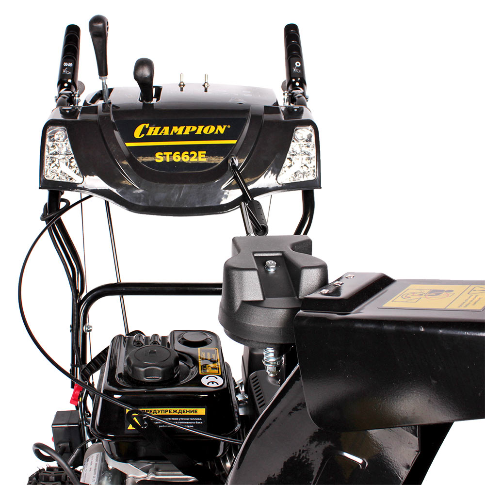 Снегоотбрасыватель CHAMPION ST662E подходит для уборки тяжелого и обледенелого снега. Оснащен двухступенчатой системой шнеков, которая позволяет ему отбрасывать снег на расстояние до 11 м.rnЭлектрический стартер, подключаемый к электросети, обеспечивает легкий запуск мотора при любой температуре.rnФары позволят проводить работы в условиях зимних сумерек.rnОбогрев рукояток обеспечивает комфортную работу в холод.