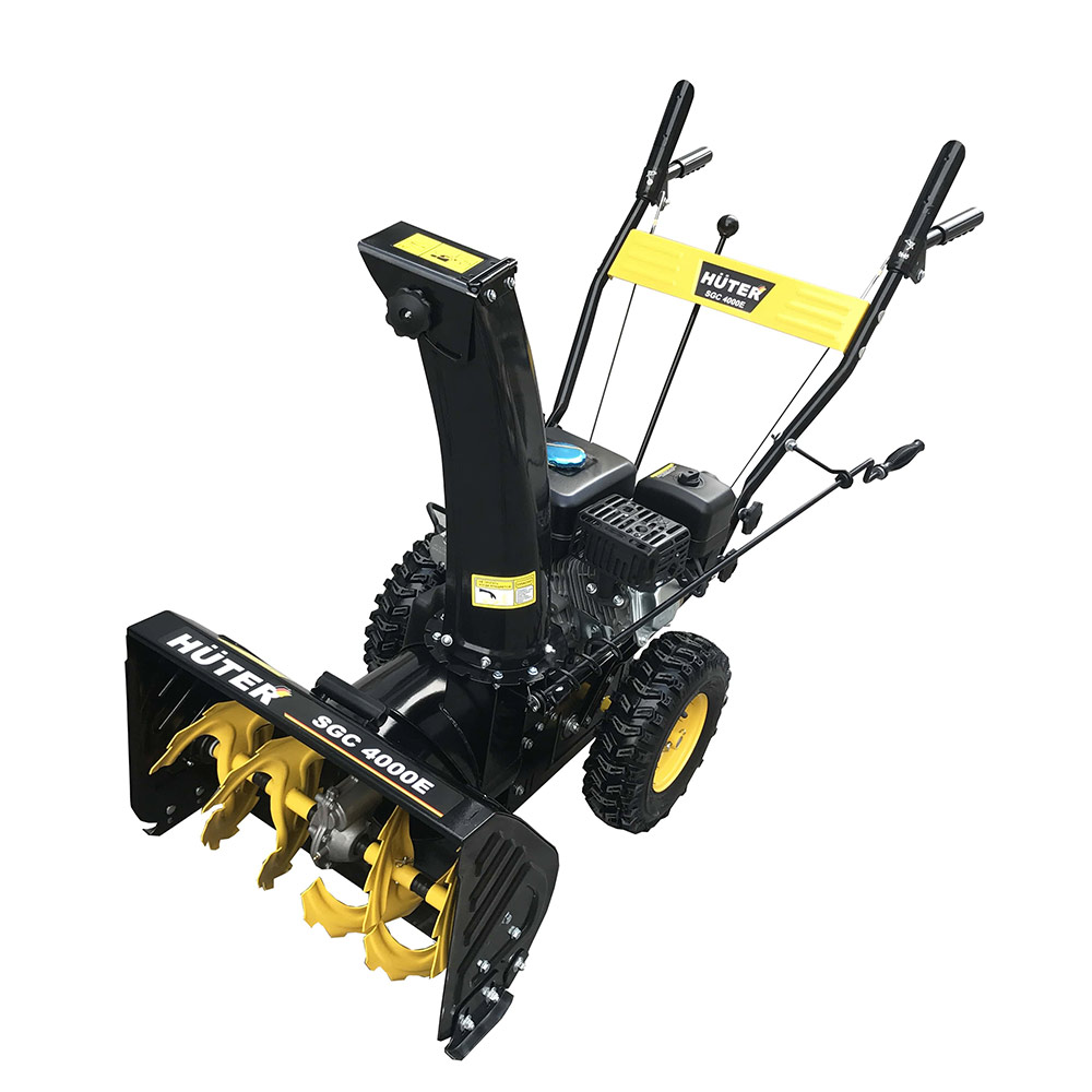 Снегоуборщик бензиновый Huter SGC 4000E имеет узнаваемую желто-черную расцветку, свойственную технике бренда Huter. rnМодель готова похвастаться передовым техническим оснащением и высокой степенью надежности, благодаря чему обеспечивается эффективная уборка снега с участка с минимальными затратами времени и сил. Устройство относится к категории колесных снегоуборщиков: за счет присутствия в конструкции двух колес гарантируется его маневренность при поворотах. Данная модель является самоходной за счет бензинового двигателя, которым она оборудована.rnБензиновый снегоуборщик Huter SGC 4000E получил двухступенчатую систему шнеков, за счет которой он эффективно справляется с измельчением и выбросом затвердевшего снега. Двигатель обладает мощностью 4000 Вт (6.5 л.с.), благодаря чему данная модель подходит для уборки больших площадей. Удобство при запуске двигателя обеспечивает электрический стартер. Топливный бак обладает емкостью 3 л. Устройство оборудовано достаточно большим ковшом с размерами 560x420 мм (ширина и высота соответственно).