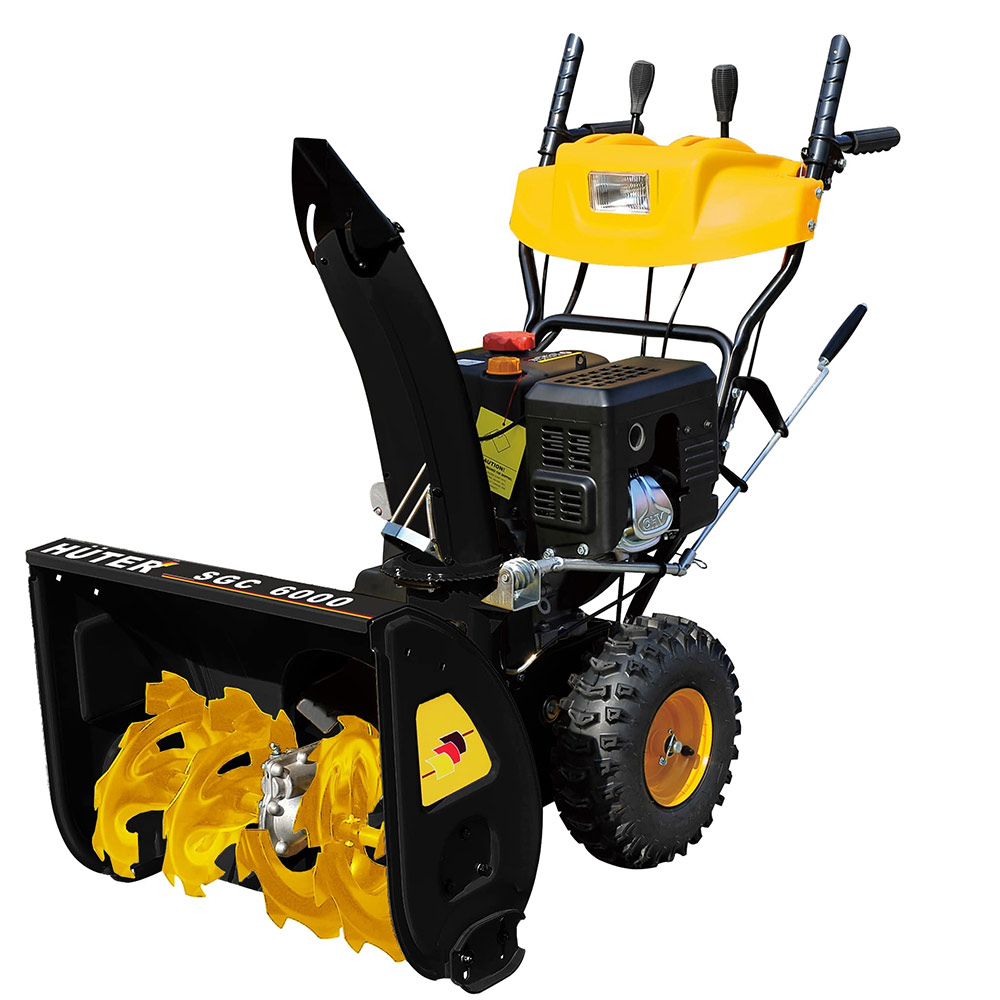 Снегоуборщик бензиновый Huter SGC 6000 относится к числу самоходных моделей и оснащается парой колес с резиновыми шинами для перемещения по очищаемой от снега территории.rnБлагодаря двухступенчатому зазубренному шнеку, выполненному из металла, агрегат с габаритами ковша 620x540 мм уверенно справляется с удалением как свежевыпавшего, так и слежавшегося снега на подъездной дорожке, на парковке, у дома. Маневренный снегоуборщик получил трансмиссию с 6 передачами для движения вперед и двумя скоростями заднего хода.rnСнегоуборщик Huter SGC 6000 поддерживает регулировку дальности выброса снега, дает возможность выбора стороны выброса. В нем применен эффективный и экономичный 4-хтактный двигатель мощностью 6000 Вт (8 л.с.), который получает бензин из топливного бака объемом 3.6 литра. Двигатель располагает как электрическим, так и ручным стартером, так что у вас не возникнет проблем с его запуском при низких температурах и других сложных погодных условиях.