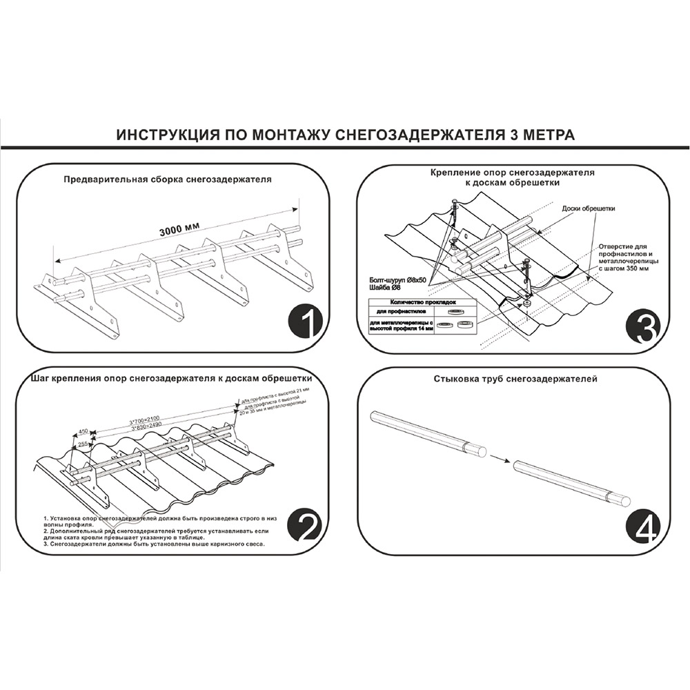 Установка опор снегозадержателей должна быть произведена строго в низ волны профиля по периметру кровли одной сплошной линией. Снегозадержатели должны быть установлены выше карнизного свеса.