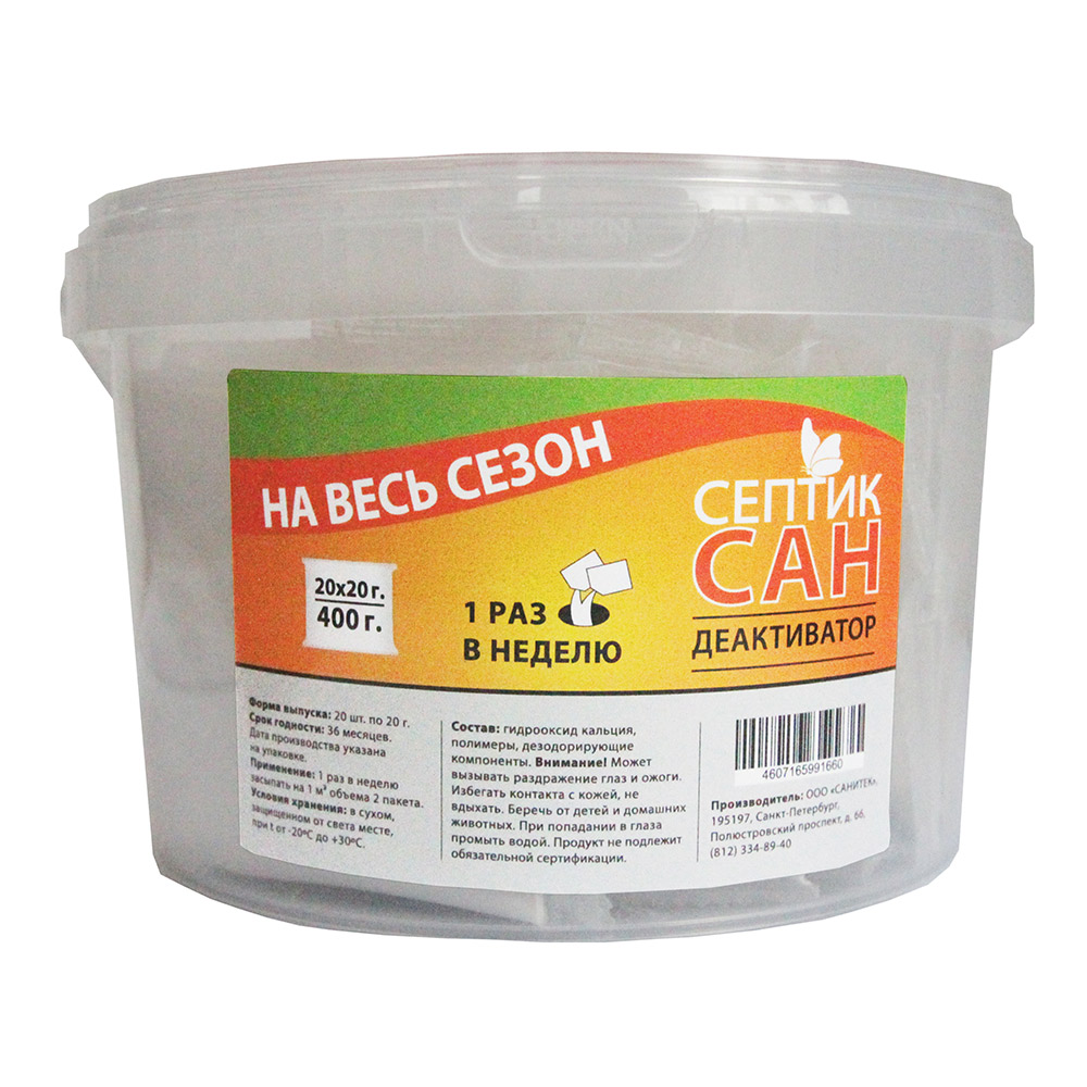 В составе используются безопасные экологичные биопрепараты, не содержащие фосфатов и хлора. Устраняет запах, разжижает отходы, разлагает отходы и туалетную бумагу, уменьшает объем твердых масс. Применение: 1 пакетик из расчета 40 гр. на 1 23 объема один раз в две-три недели.