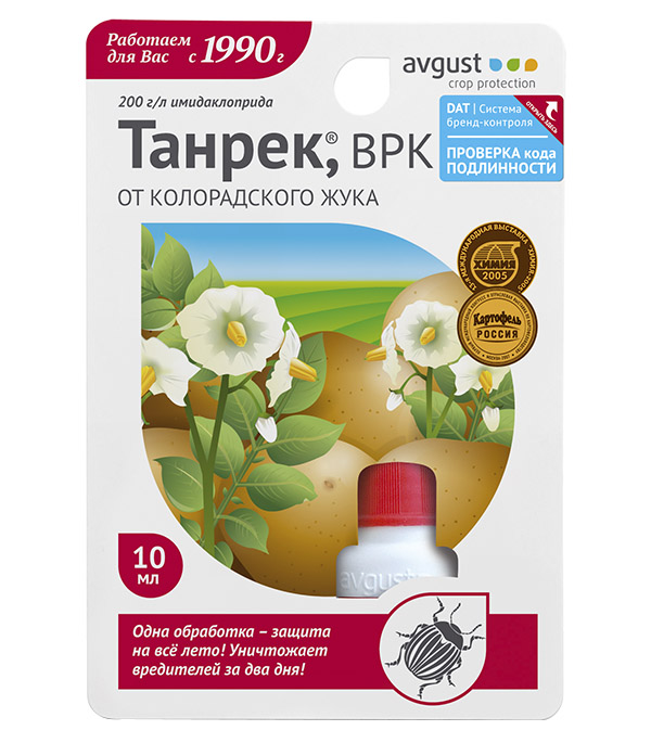 Проверенный временем препарат для борьбы с личинками и взрослыми особями колорадского жука Действующее вещество 200 г/л имидаклоприда. Обладает системным механизмом действия. Действует на взрослых жуков и личинок разных возрастов. rnПри выпадении осадков не смывается с растения, сохраняя полную защиту всех его частей. Защищает культуру длительное время, поэтому можно ограничиться единичной обработкой посадки. Эффективно действует при широком диапазоне температур. Препарат поражает нервную систему насекомых при попадании на них раствора или питании обработанным растением. Взрослые жуки и личинки утрачивают способность двигаться, они прекращают питаться, а через 2–3 суток погибают. Благодаря повышенной стойкости препарата к смыванию дождевой водой защитный эффект сохраняется до 3 недель.