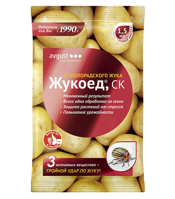 Новый трёхкомпонентный препарат от колорадского жука. Действующее вещество: 125 г/л альфа-циперметрина+100 г/л имидоклоприда+50 г/л клотианидина.rnНовое решение в борьбе с колорадским жуком! Жукоед — инновационный препарат от колорадского жука на картофеле, в состав которого входят три активных действующих вещества, принадлежащие к разным классам химических соединений, отличающихся по механизму действия и физическим свойствам: Жукоед обладает высокой скоростью действия и уничтожает даже скрытоживущих вредителей и питающихся на нижней стороне листа. Одна обработка препаратом Жукоед обеспечивает защиту картофеля на весь сезон. Действие препарата Жукоед не зависит от температуры и влажности воздуха.rnЖукоед — это не просто отрава от колорадского жука, ведь его применение повышает устойчивость картофеля к неблагоприятным воздействиям окружающей среды. Усиливает процесс фотосинтеза, способствуя увеличению вегетативной массы, тем самым улучшая качество картофеля.