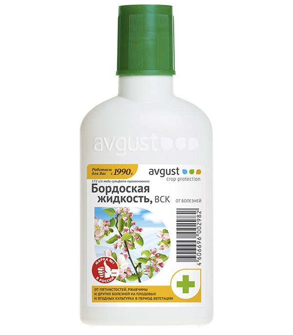 Препарат для обработки плодовых и ягодных культур от болезней ранней весной и в период вегетации. Действующее вещество: 172 г/л меди сульфата трёхосновного. Защищает от парши, монилиоза, коккомикоза, плодовой гнили и различных пятнистостей. rnЛегко применять, достаточно просто разбавить водой. Не вызывает ожогов на растениях. Препарат относится к категории контактных фунгицидов и представляет собой водно-суспензионный концентрат (ВСК) трехосновного сульфата меди. Готовая Бордоская жидкость во флаконе отличается эффективным действием и удобством применения, благодаря чему получила широкое применение в личных подсобных хозяйствах и на дачных участках.