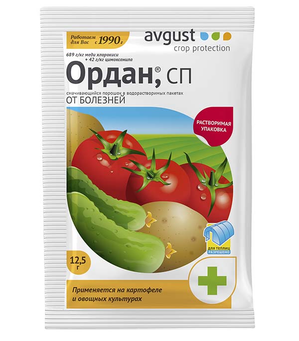 Незаменимое лекарство от болезней томатов, огурцов и картофеля. Действующее вещество: 689 г/кг меди хлорокиси+42 г/кг цимоксанила. Характеризуется уникальным сочетанием двух активных веществ с различным механизмом действия. Обладает профилактическими, защитными и искореняющими свойствами. rnНе вызывает привыкания у возбудителей болезней. Выпускается также в инновационной водорастворимой упаковке. Препарат применяют для борьбы с фитофторой, пероноспорозом и альтернариозом. В состав «Ордана» входят два биоактивных компонента, благодаря которым он производит комплексное действие:rnпредотвращает проникновение спор и мицелия гриба сквозь поверхностные покровы; исцеляет поврежденные болезнью растения; угнетает и искореняет возбудителей инфекции, локализуя ее. Привыкаемость к препарату «Ордан» минимальна, в то же время он малотоксичен для человека при соблюдении правил безопасности.