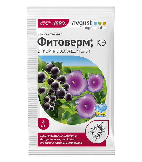 Биопрепарат для борьбы с комплексом вредителей на различных культурах. Действующее вещество 2 г/л аверсектина. Высокая скорость воздействия – насекомые прекращают питание уже через 6-8 часов, а их полная гибель наступает через 3-4 дня. Применяется также для защиты от клещей. Имеет минимальные сроки до сбора урожая. основным компонентом которого являются продукты жизнедеятельности почвенных микроорганизмов. Он эффективен в борьбе более чем с двумя десятками видами вредителей. Подходит для обработки как уличных, так и комнатных растений. Период защитного действия препарата составляет 7–20 дней.