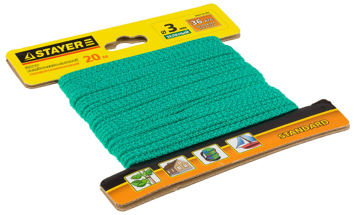 STAYER 20 м, 3 мм, полипропиленовый, вязанный, без сердечника, зеленый, шнур хозяйственно-бытовой 50422-03-020