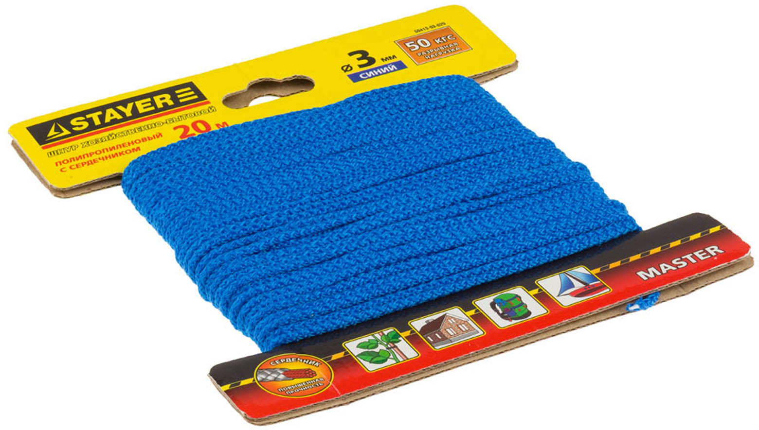 STAYER 20 м, 3 мм, полипропиленовый, вязанный, с сердечником, синий, шнур хозяйственно-бытовой 50413-03-020