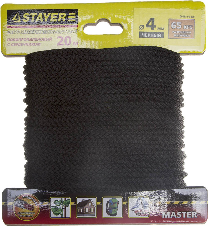 STAYER 20 м, 4 мм, полипропиленовый, вязанный, с сердечником, черный, шнур хозяйственно-бытовой 50411-04-020
