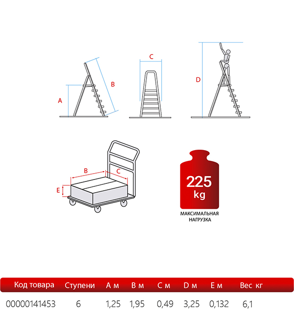 Предназначена для выполнения строительных, ремонтных, отделочных или иных видов работ, когда необходимо произвести какие-либо действия на высоте.rnВ основании стремянки прочная рама из алюминиевого профиля прямоугольного сечения. Пластиковые наконечники препятствуют скольжению, и обеспечивают отличную устойчивость. Многократное клепаное соединение ступеней с рамой обеспечивает исключительную надежность и безопасность при работе на стремянке. Имеет шесть ступеней шириной 130 мм, что позволяет стопе комфортно размещаться на лестнице. rnРабочая высота – это параметр, рассчитываемый путем сложения высоты верхней секции лестницы/стремянки и роста человека с вытянутой вверх рукой (в среднем, два метра).