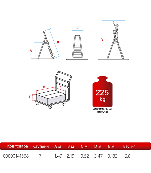 Предназначена для выполнения строительных, ремонтных, отделочных или иных видов работ, когда необходимо произвести какие-либо действия на высоте.rnВ основании стремянки прочная рама из алюминиевого профиля прямоугольного сечения. Пластиковые наконечники препятствуют скольжению, и обеспечивают отличную устойчивость. Многократное клепаное соединение ступеней с рамой обеспечивает исключительную надежность и безопасность при работе на стремянке. Имеет семь ступеней шириной 130 мм, что позволяет стопе комфортно размещаться на лестнице. rnРабочая высота – это параметр, рассчитываемый путем сложения высоты верхней секции лестницы/стремянки и роста человека с вытянутой вверх рукой (в среднем, два метра).