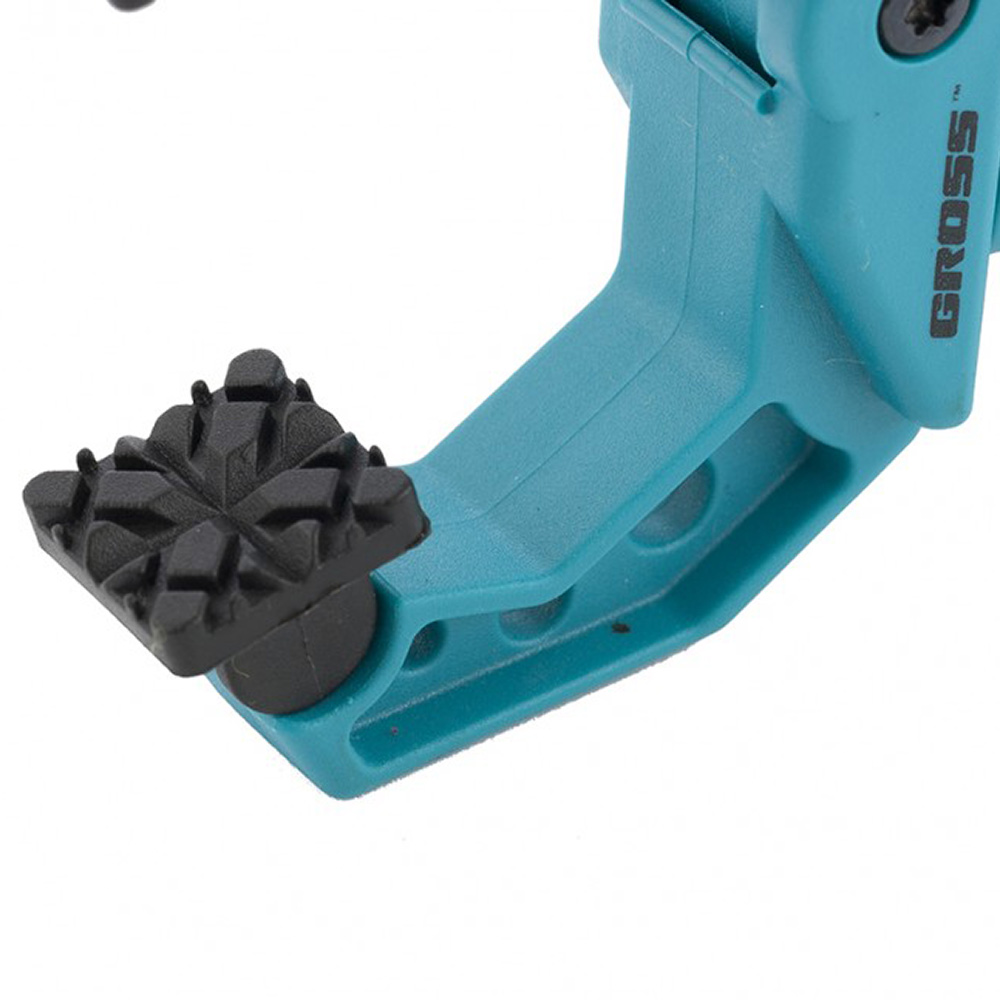 Струбцина клещеобразная торговой марки GROSS предназначена для фиксации и удержания деталей и заготовок различных конструкций диаметром до 38 мм.rnПрижимные накладки на шарнирах позволяют размещать деталь под разными углами.rnХраповой механизм обеспечивает надежную и жесткую фиксацию заготовок/деталей в отличие от механизма пружинных струбцин прищепочного типа.rnПри нажатии на курок происходит мгновенное раскрытие струбцины. Двухкомпонентная рукоятка позволяет комфортно удерживать инструмент в руке при эксплуатации.