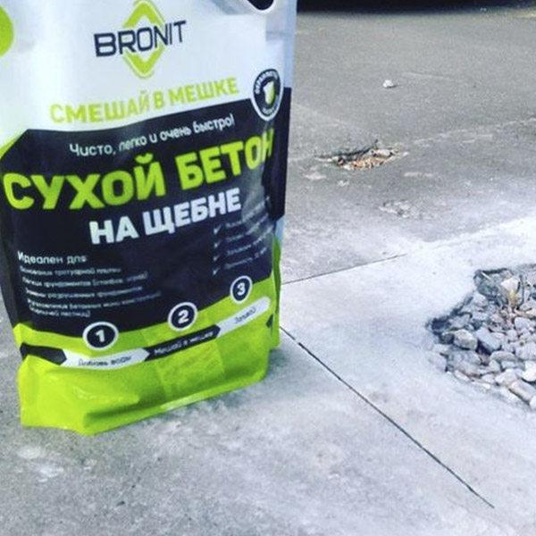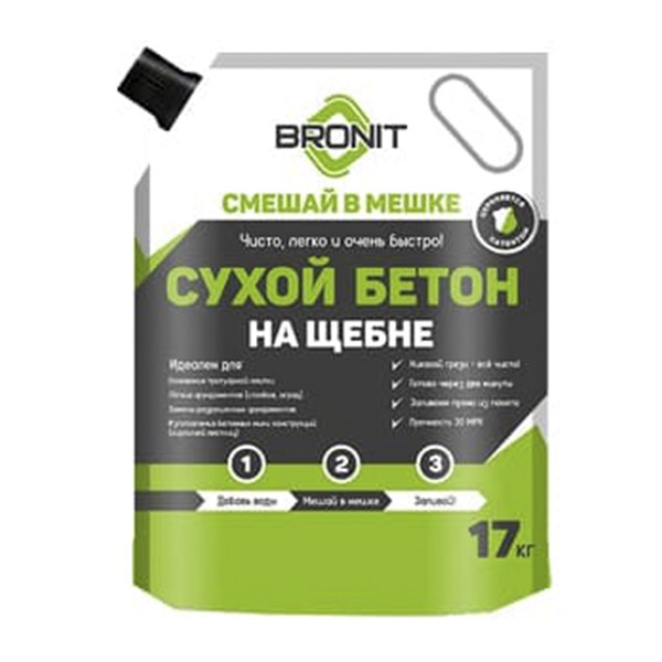 Bronit – это сухая смесь для бетонирования. Вам не понадобятся емкости для смешивания, миксер и пр. В помещении, где будете готовить раствор не будет пыли и грязи. Нужна только упаковка Bronit и вода.rnПредназначен для высококачественного бетонирования и устройства стяжек полов, лестниц, укладки фундамента, возведения отмостки, заделки швов, трещин, выбоин, углублений, монтажа и крепления металлических и строительных элементов и конструкций.