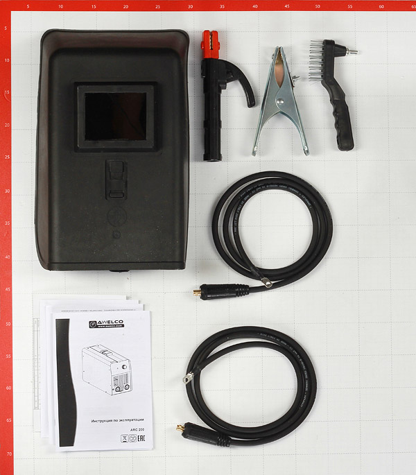 Сварочный аппарат, зажим массы и держатель электрода (длина сварочных кабелей – 1.5 м, сечение провода – 20 мм², разъём Dinse 25) маска, молоток сварщика.
