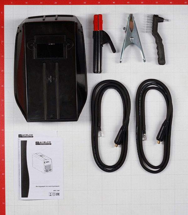 Сварочный аппарат, зажим массы и держатель электрода (длина сварочных кабелей – 1.8 м, сечение провода – 25 мм², разъём Dinse 25) маска, молоток сварщика.