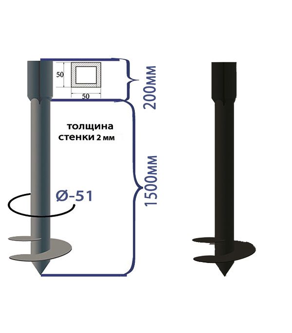 Свая-стойка винтовая d51 мм h1700 мм (50х50 h200 мм; d51 мм h1500 мм)