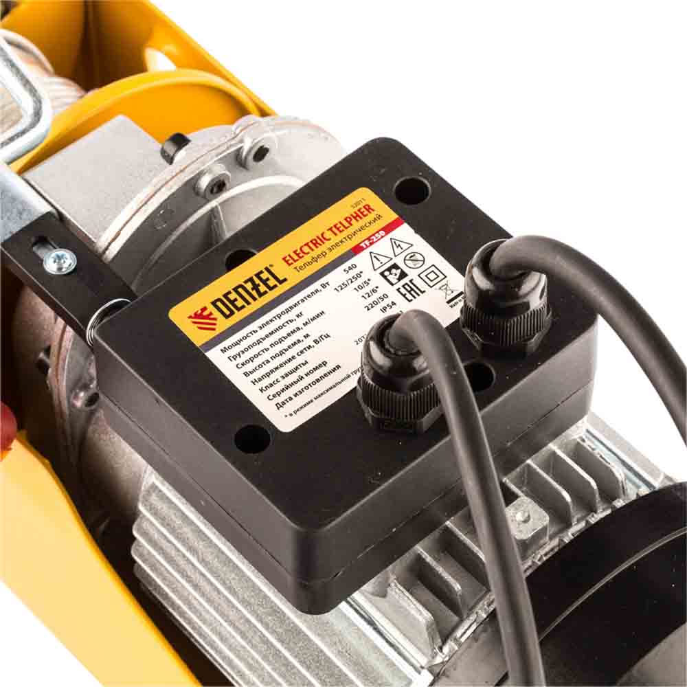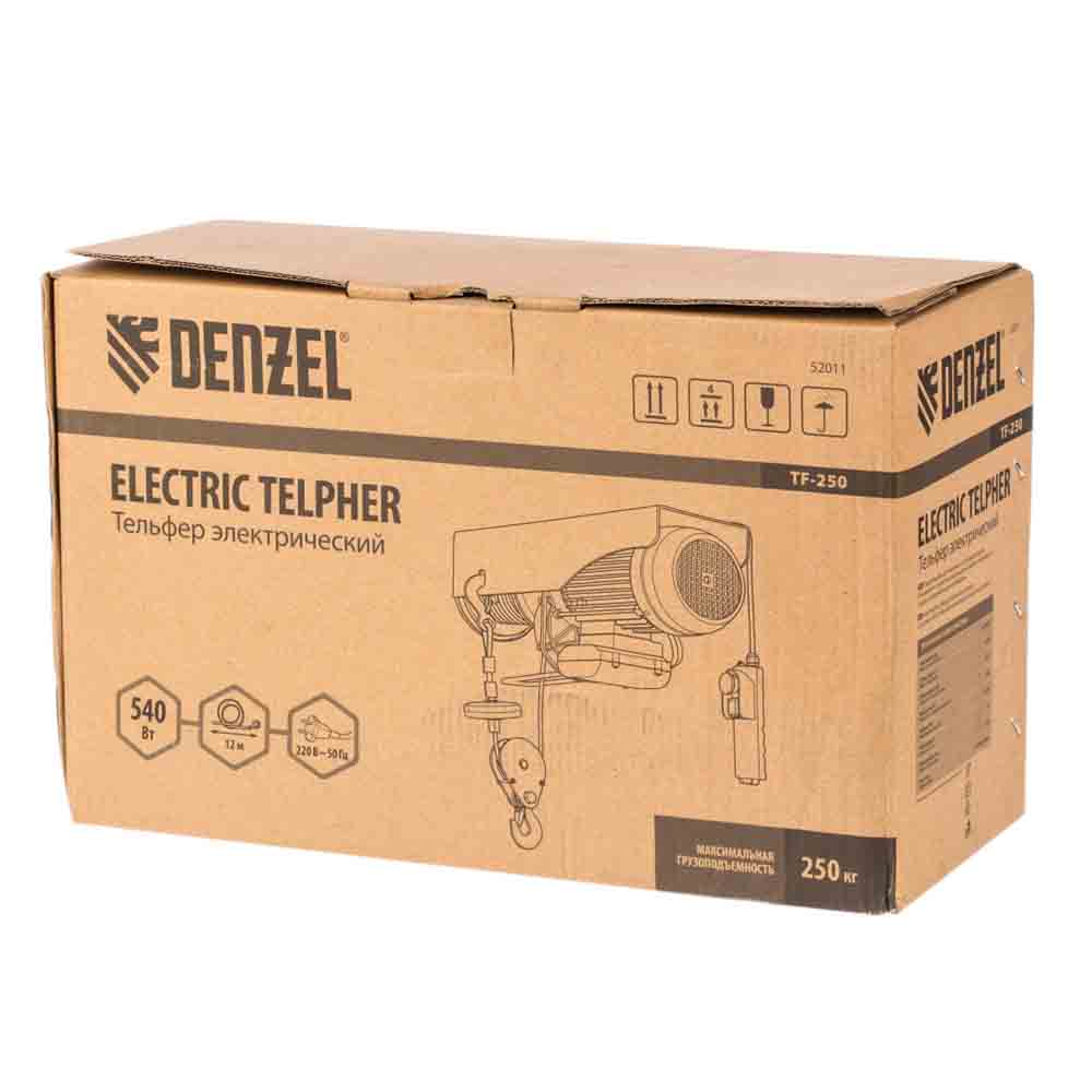 Электрический тельфер TF250 торговой марки DENZEL предназначен для поднятия груза массой до 250 кг.rnПри мощности двигателя тельфера 540 Вт скорость подъема груза составляет 10 м/мин.rnОтличительной особенностью модели TF250 является медная обмотка двигателя, которая повышает долговечность работы двигателя.rnНабор кронштейнов, входящих в комплектацию, позволяет осуществить крепление тельфера на стальной трубе.rnВысота подъема до 12 метров.rnТранспортировка при температуре окружающй среды от -20 до +55 °С, хранение от 0 до +40 °СrnЭксплуатация при температуре ниже 0 °С запрещена.