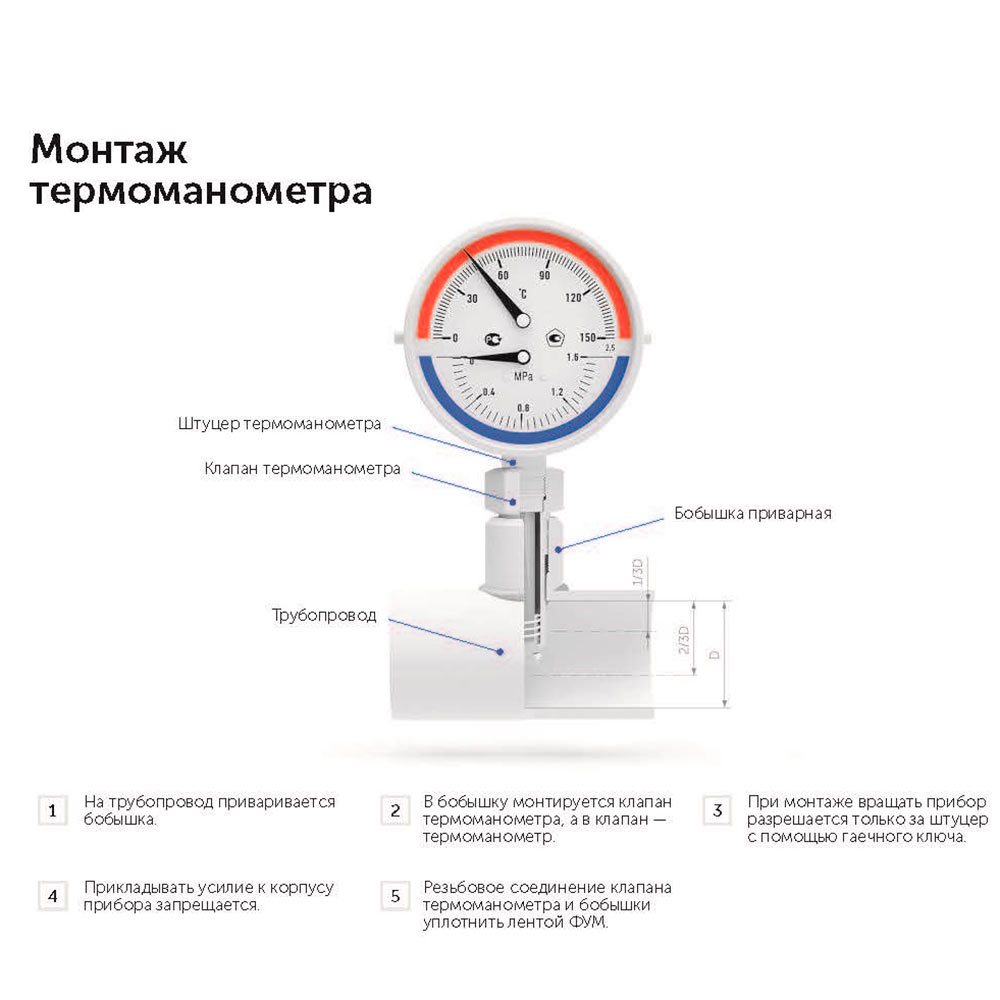 Предназначен для одновременного измерения избыточного давления и температуры воды и других сред, неагрессивных к сплавам меди.rnПредставляет собой объединенные в одном корпусе манометр и термометр.rnДля снятия показаний предусмотрены две шкалы – давления и температуры.rnШток для подключения находится на торце корпуса ( радиальное присоединение).rnПрибор комплектуется клапаном, позволяющим демонтировать термоманометр без разгерметизации системы.