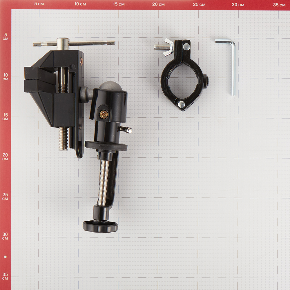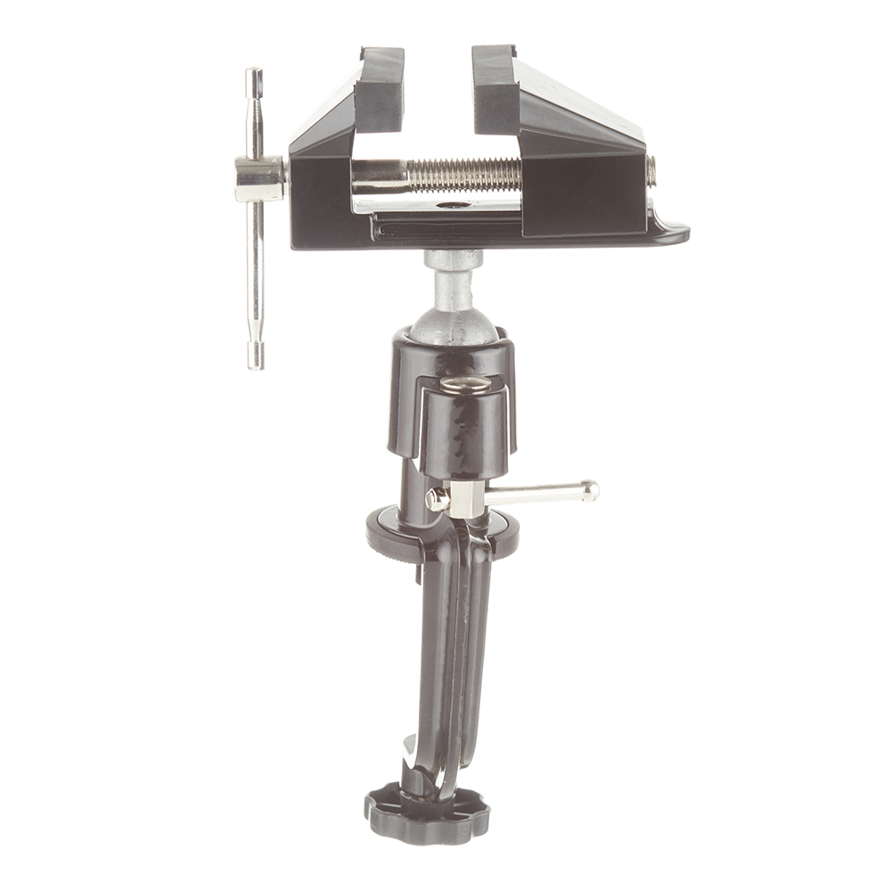 крепежной струбциной, позволяющей крепить тиски к любым плоскостям толщиной не более 2” (50 мм); шарнирным механизмом, что позволяет вращать и фиксировать рабочую верхнюю часть инструмента под нужным углом наклона с амплитудой в 360 градусов.