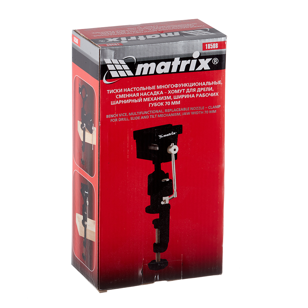 Тиски настольные многофункциональные Matrix предназначены для фиксации различных деталей малых размеров и для их обработки.rnПрименяются преимущественно для тонких слесарных и столярных работах (ювелирные, радио и др.).rnОснащены резиновыми накладками на рабочих прижимных губках для работы с деталями из нежных и хрупких материалов и сменной насадкой – зажимным хомутом для крепления дрели.