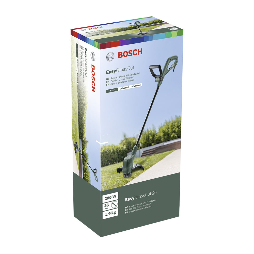 Электрический триммер Bosch EasyGrassCut 26 предназначен для бытового применения с целью подстригания травы, сорняков и крапивы.rnОн подойдет для кошения травы, которая растет на склонах, под препятствиями и по краям газона и которую трудно убрать газонокосилкой.rnНе предназначен для применения в качестве мотокосы. Садовый инструмент не предназначен для промышленного и коммерческого применения. rnЭтот триммер отличается особым удобством в использовании и поможет докосить траву по краям газона, в уголках сада, где трудно работать с косилкой.rnЛеска подается поуавтоматически при каждом нажатии на кнопку пуска – вам не надо следить за леской постоянно и вытягивать ее каждый раз при необходимости.rnИнструмент имеет дополнительную ручку, которая позволяет легко подстроить его под рост ползователя, не надо будет сгибать спину при кошении. При весе инструмента менее 2кг работа станет более удобной. rnВысококачественная отделка, мощный двигатель и долговечность обеспечивают идеальные результаты.rnВысокое качество стрижки 280 Вт и 12 500 об/мин гарантируют быструю и аккуратную стрижку газона.