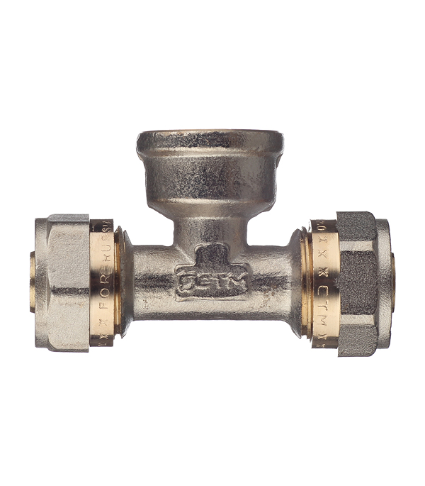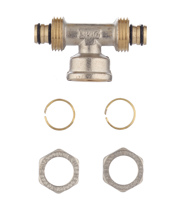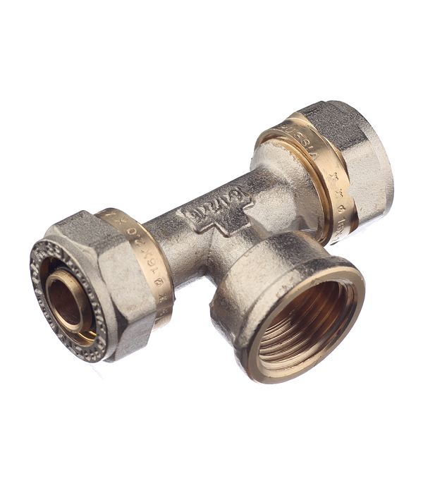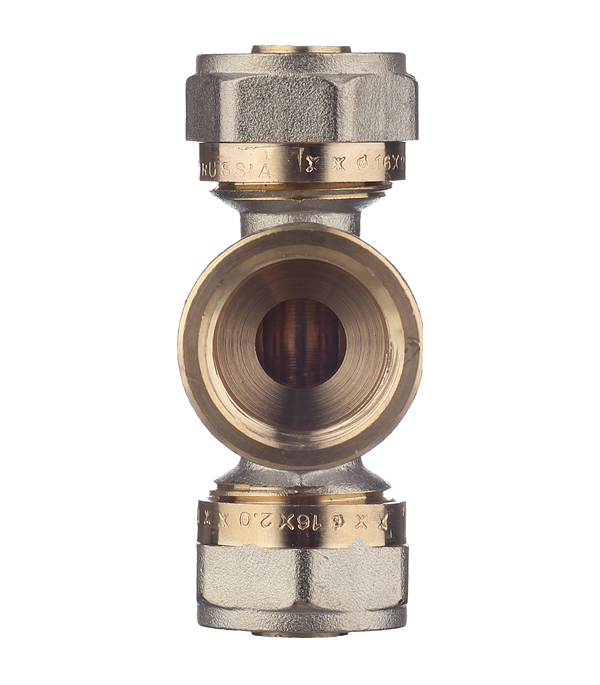Предназначен для разветвления потока воды на два направления. Имеет два выхода для соединения металлопластиковых труб диаметром 16 мм методом обжима и один выход с внутренней резьбой 1/2(16 мм).