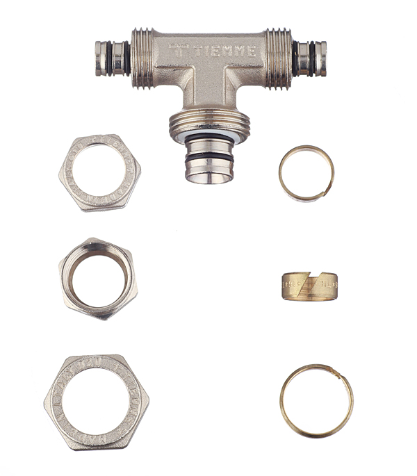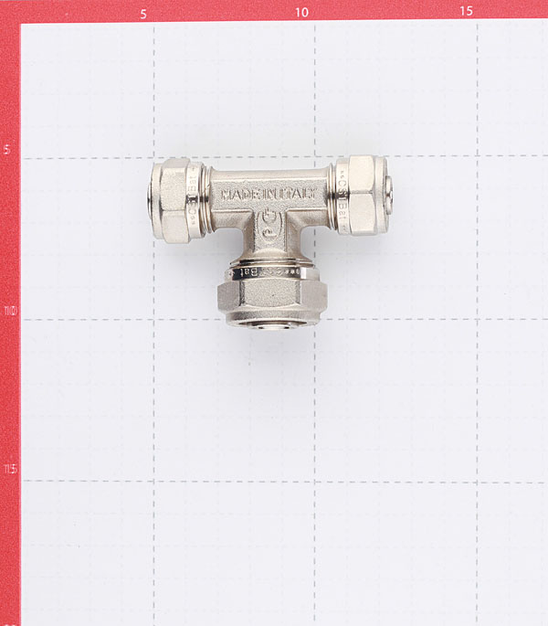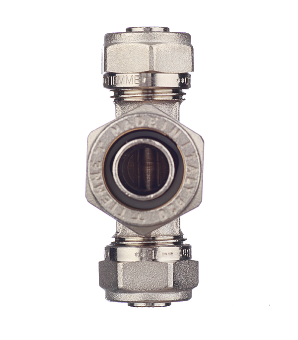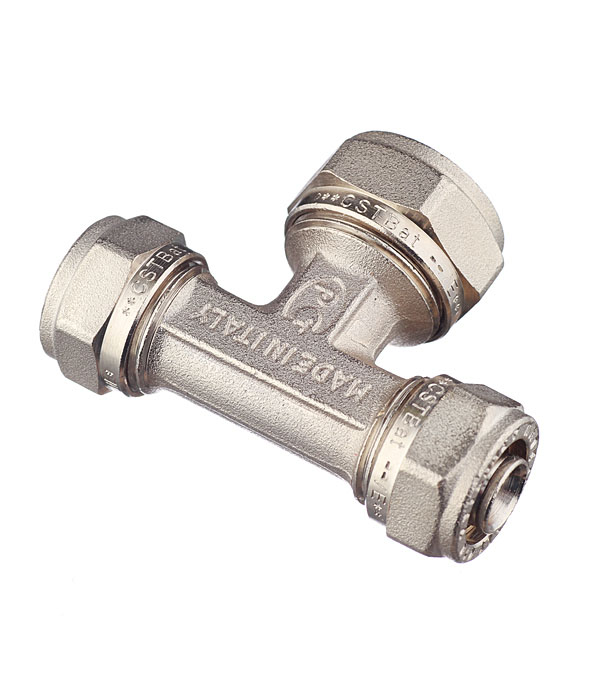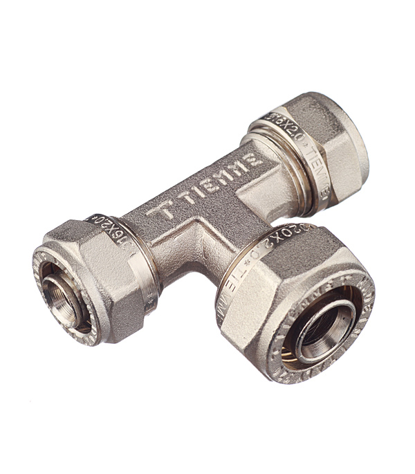 Предназначен для разветвления потока воды на два направления, а именно для соединения методом обжима двух металлопластиковых труб диаметром 16 мм с трубой диаметром 20 мм.