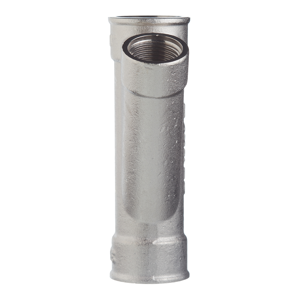 Фитинг резьбовой – тройник косой – предназначен для монтажа на трубопроводе гильзы для погружного датчика температуры VTr.551. Наклон оси бокового патрубка на 25° позволяет выполнить узел присоединения датчика максимально компактным.rnТройник выполнен из латуни CW617N методом горячего прессования с последующим нанесением никелевого покрытия и рассчитан на применение в системах с рабочим давлением до 16 бар и рабочей температурой не выше 150 °C. Размер резьбы бокового патрубка – ½”; проточных патрубков – ½, ¾”.