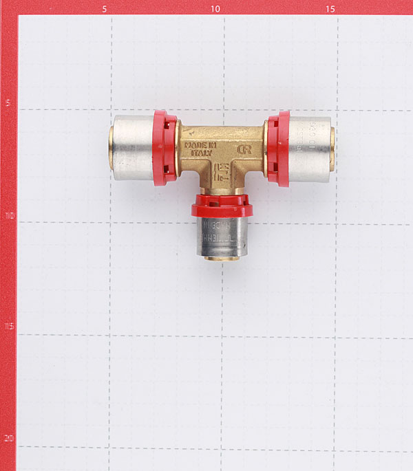 Предназначен для разветвления потока воды на два направления, а именно для соединения методом опрессовки двух металлопластиковых труб диаметром 26 мм с трубой диаметром 20 мм.