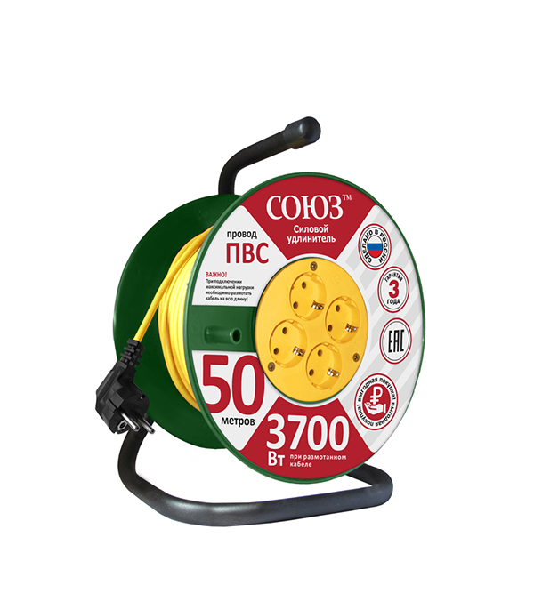 ПВС 3х1,5 – марка кабеля, 4 розетки на катушке, 3700 Вт – мощность допустимой нагрузки на удлинитель, 50м – длина кабеля удлинителя.