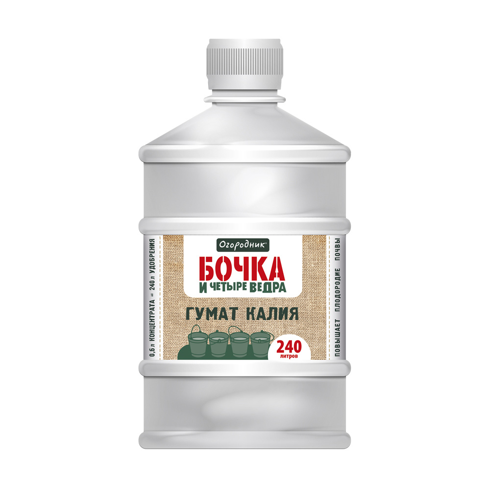 Органоминеральное удобрение гумат калия Огородник «Бочка и четыре ведра» с повышенным содержанием гуминовых кислот. Применяется для подкормок овощных, плодовых, ягодных и декоративно-цветочных культур. Обеспечивает равномерное распределение питательных веществ.