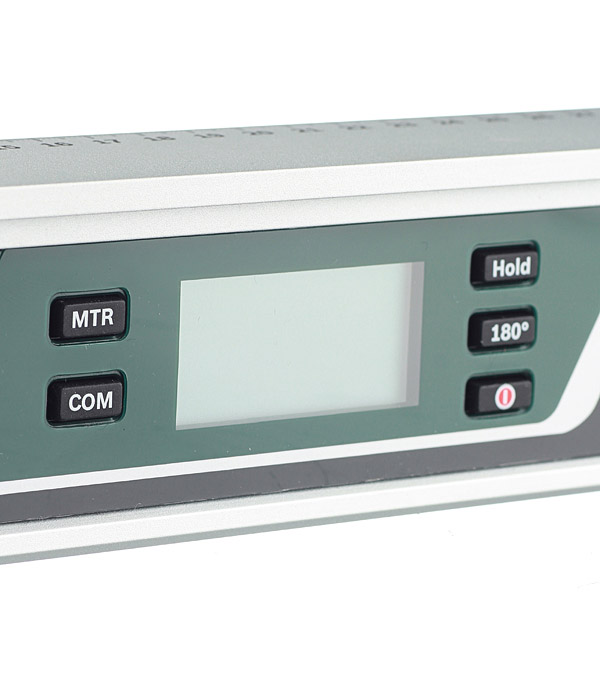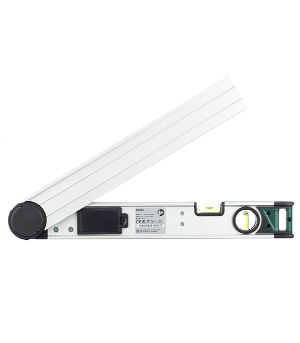 Предназначен для измерения углов. С его помощью можно измерить угол, рассчитать односторонний и двухсторонний скос, проверить вертикаль и горизонталь в диапазоне от 0° до 220°. Простое управление: акустический сигнал, функции запоминания и расчёта, а также автоматический переворот индикации при работе над головой для удобства работы. В комплект поставки входит удлинительная линейка для измерения в труднодоступных местах. Автоматическое отключение через 5 мин.
