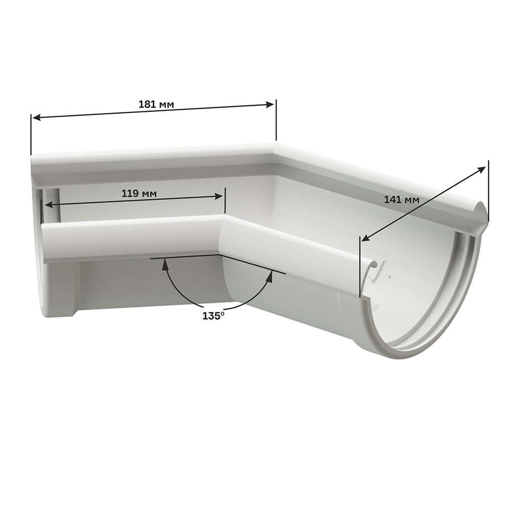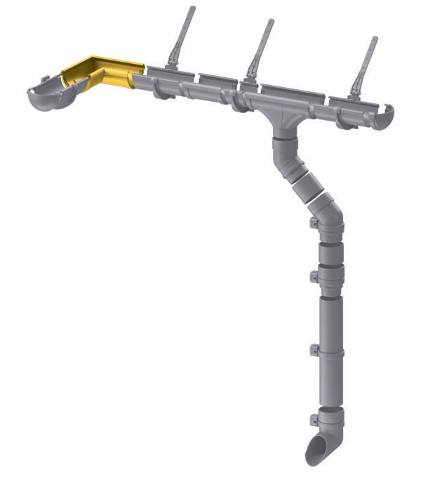 Устанавливается на внешних и внутренних углах кровли и предназначен для соединения желобов под углом 135° в целях изменения направления движения воды.
