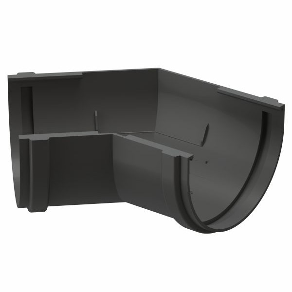 Угол желоба устанавливается на внешних и внутренних углах кровли и предназначен для соединения желобов под углом 135 в целях изменения направления движения воды. Нет резинового уплотнителя.