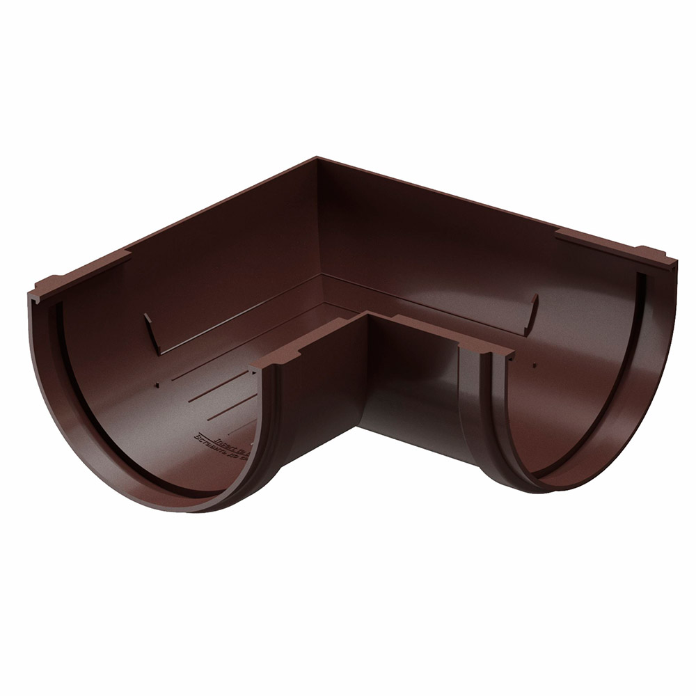 Угол желоба устанавливается на внешних и внутренних углах кровли и предназначен для соединения желобов под углом 90° в целях изменения направления движения воды.