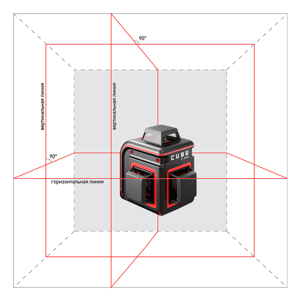 одну горизонтальную и две вертикальных линии. Все линии имеют развертку 360°. Луч для разметки будет видно в любой точке. Больше нет необходимости вращать прибор. Достаточно установить ADA CUBE 3-360 на выбранной высоте. При включении вертикальных линий получается перекрещивающиеся под углом 90º плоскости. Очень удобно при выравнивании стен и углов между стенами. Лазерные линии можно поочередно отключать, оставляя только необходимые для работы.