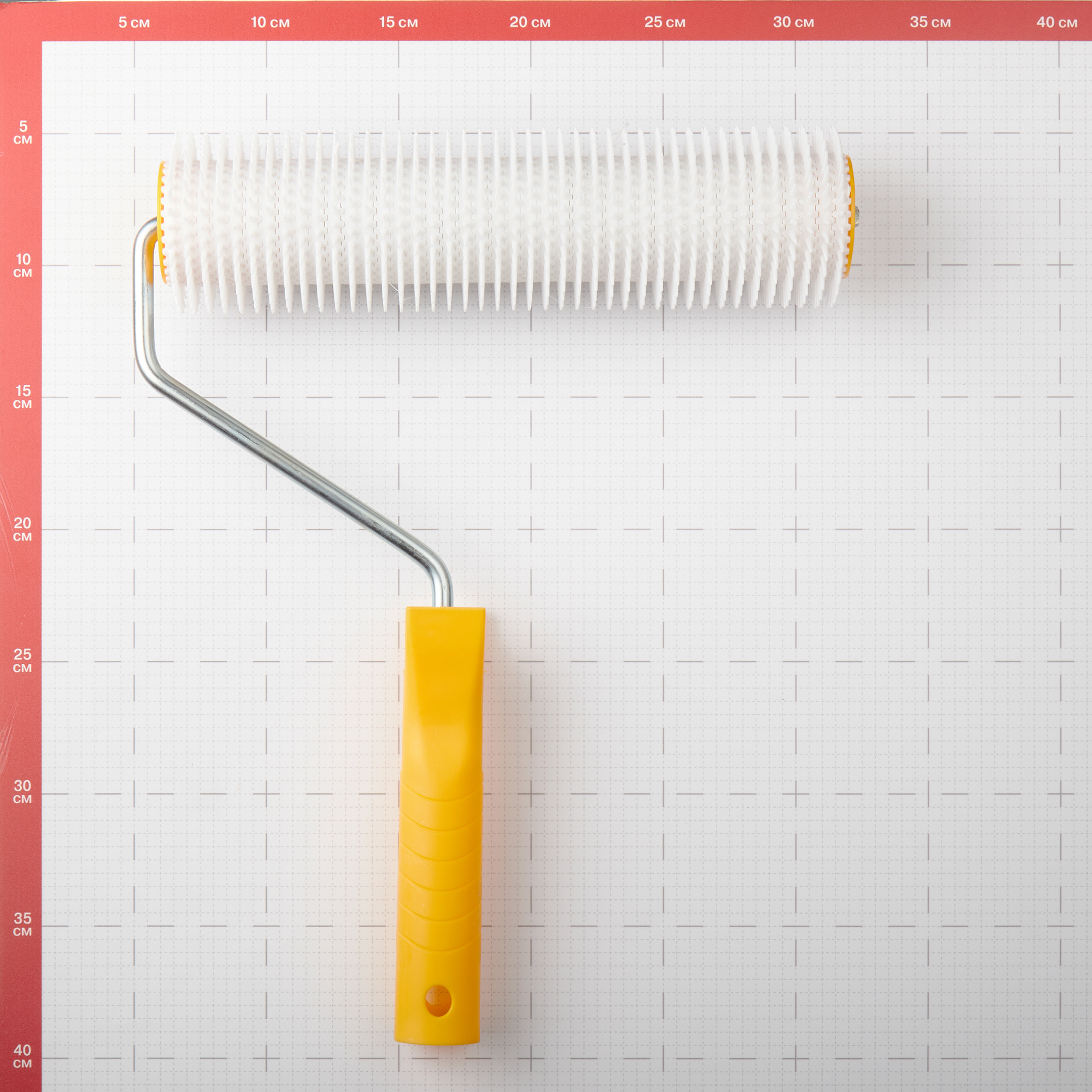 Предназначен для равномерного распределения наливных полов по поверхности, а так же для удаления пузырьков воздуха образующихся в процессе замешивания наливных составов. rnРукоятка изготовлена из пластика, имеет отверстие для телескопического стержня.rnВысота игл 11 мм, конические концы игл.