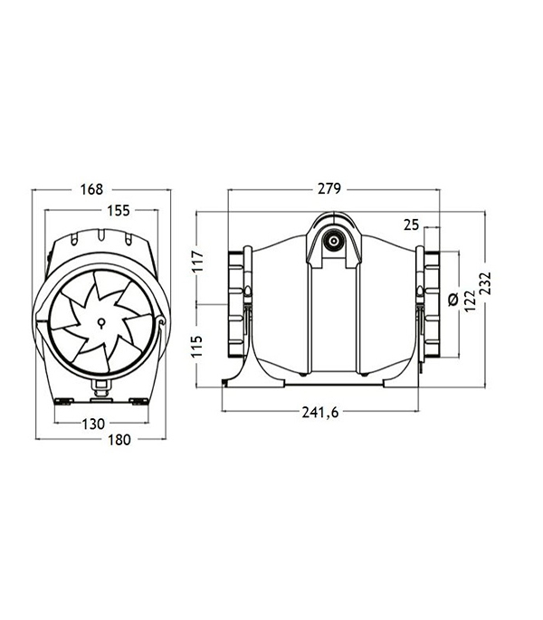 высота 168 мм, ширина 217 мм, диаметр присоединяемого воздуховода 125 мм.