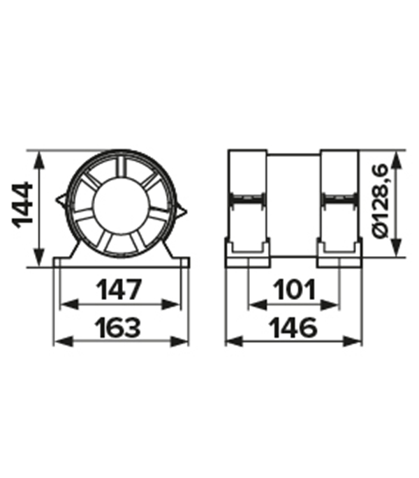высота 144 мм, ширина 163 мм, глубина 146 мм, диаметр присоединяемого воздуховода 125-127 мм.