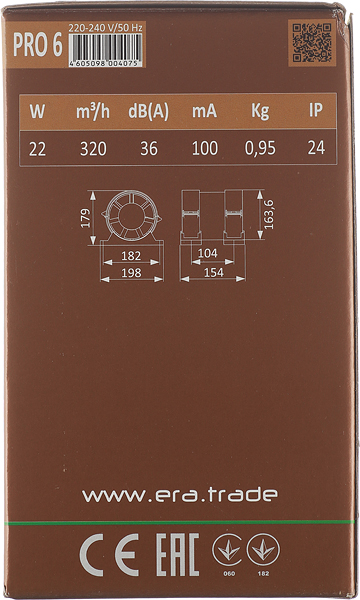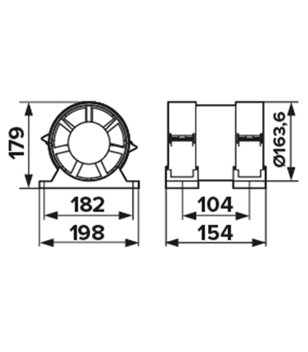 высота 179 мм, ширина 198 мм, глубина 154 мм, диаметр присоединяемого воздуховода 160 мм.