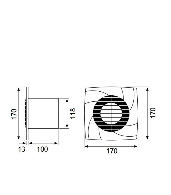 высота 170 мм, ширина 170 мм, диаметр присоединяемого воздуховода 120 мм.