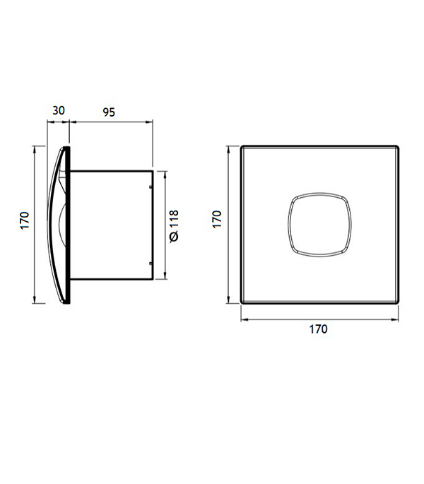высота 170 мм, ширина 170 мм, диаметр присоединяемого воздуховода 120 мм.