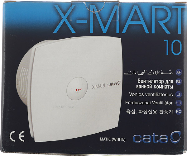 Бытовой вытяжной вентилятор серии X-MART. Наиболее распространенная серия из модельного ряда Cata.rnПередняя панель снимается без винтов (отвертки) для более простой очистки, простая система установки, аэродинамическая (обтекаемая) форма для улучшения потока воздуха.rnПредназначен для постоянной или периодической вытяжной вентиляции санузлов, ванных комнат, кухонь и других бытовых помещений.rnИмеет двигатель с защитой от перегрева и световой индикатор работы.rnУстанавливается в вентиляционную шахту или в воздуховод соответствующего диаметра.rnВентилятор используется только для настенного монтажа.rnПодключение к сети осуществляется через отдельный выключатель или через штатный выключатель освещения в помещении.rnДля препятствия потоку воздуха в помещение установлен обратный клапан.