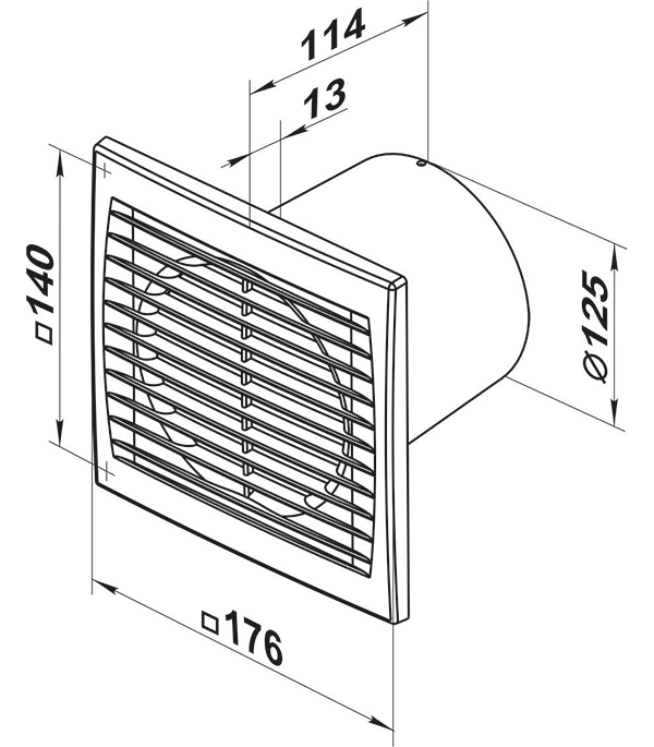высота панели 176 мм, ширина панели 176 мм, диаметр присоединяемого воздуховода 125 мм.