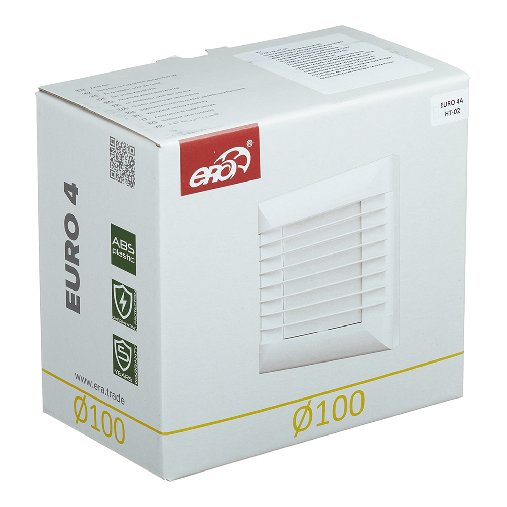 Вентилятор осевой ERA EURO с автоматическими жалюзи, датчиком влажности и тяговым выключателем D100rnПредназначен для монтажа в вентиляционные шахты или соединения с воздуховодами. rnВентилятор оборудован термоактюатором, который обеспечивает плавное открывание и закрывание автоматических жалюзи, предотвращающих обратную тягу.