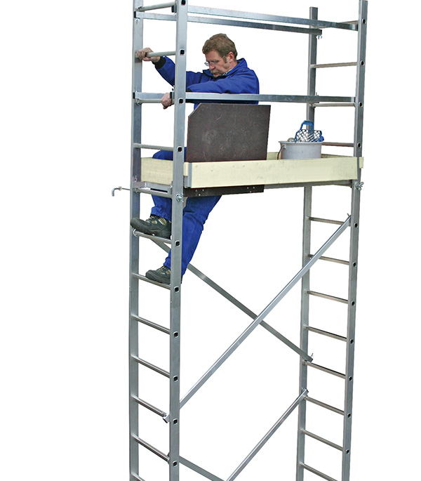 Вышка-тура – многофункциональная конструкция, состоящая из 2-х приставных лестниц с 14 ступенями и рабочей платформы 150 х 56 см (длина х ширина). Рабочую платформу можно установить на любой высоте, на каждой перекладине.rnПредназначена для выполнения ремонтно-отделочных и монтажных работ на высоте до 5 м.rnДополнительная возможность использования на лестничном марше.rnВ сложенном виде – высота 2 м.