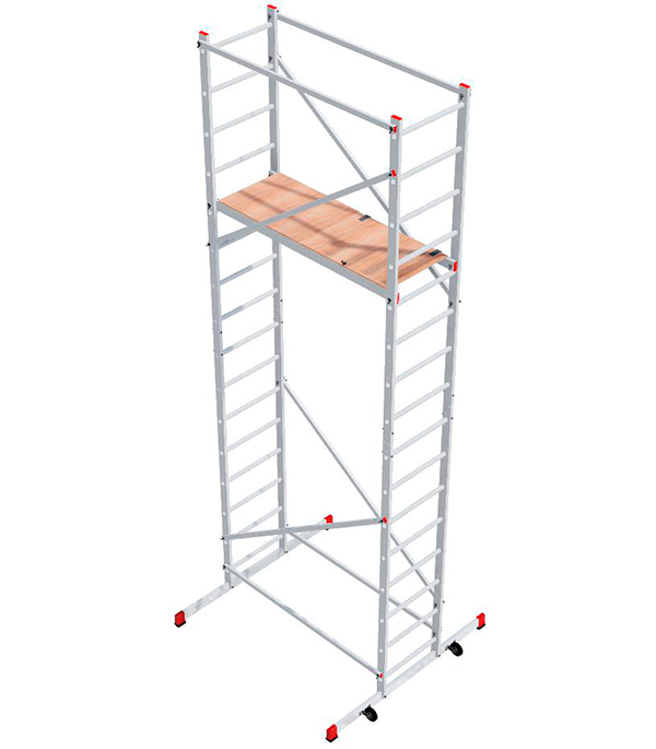 Предназначена для выполнения ремонтно-отделочных и монтажных работ на высоте до 5 метров. rnВышка-тура – многофункциональная конструкция, состоящая из 2-х приставных лестниц с 8 ступенями + комплект для наращивания высоты до 5 м и рабочая платформа 140 х 50 см (длина х ширина).rnУ вышки перфорированные ступени, которые обеспечивают безопасный подъем на высоту, широкие поперечные траверсы с двухкомпонентными противоскользящими башмаками на концах профилей для обеспечения безупречной устойчивости конструкции на опорной платформе. Ролики на одной из боковин обеспечивают удобное перемещение вышки. rnРабочая высота – это параметр, рассчитываемый путем сложения высоты верхней секции лестницы/стремянки/вышки-туры и роста человека с вытянутой вверх рукой (в среднем, два метра).