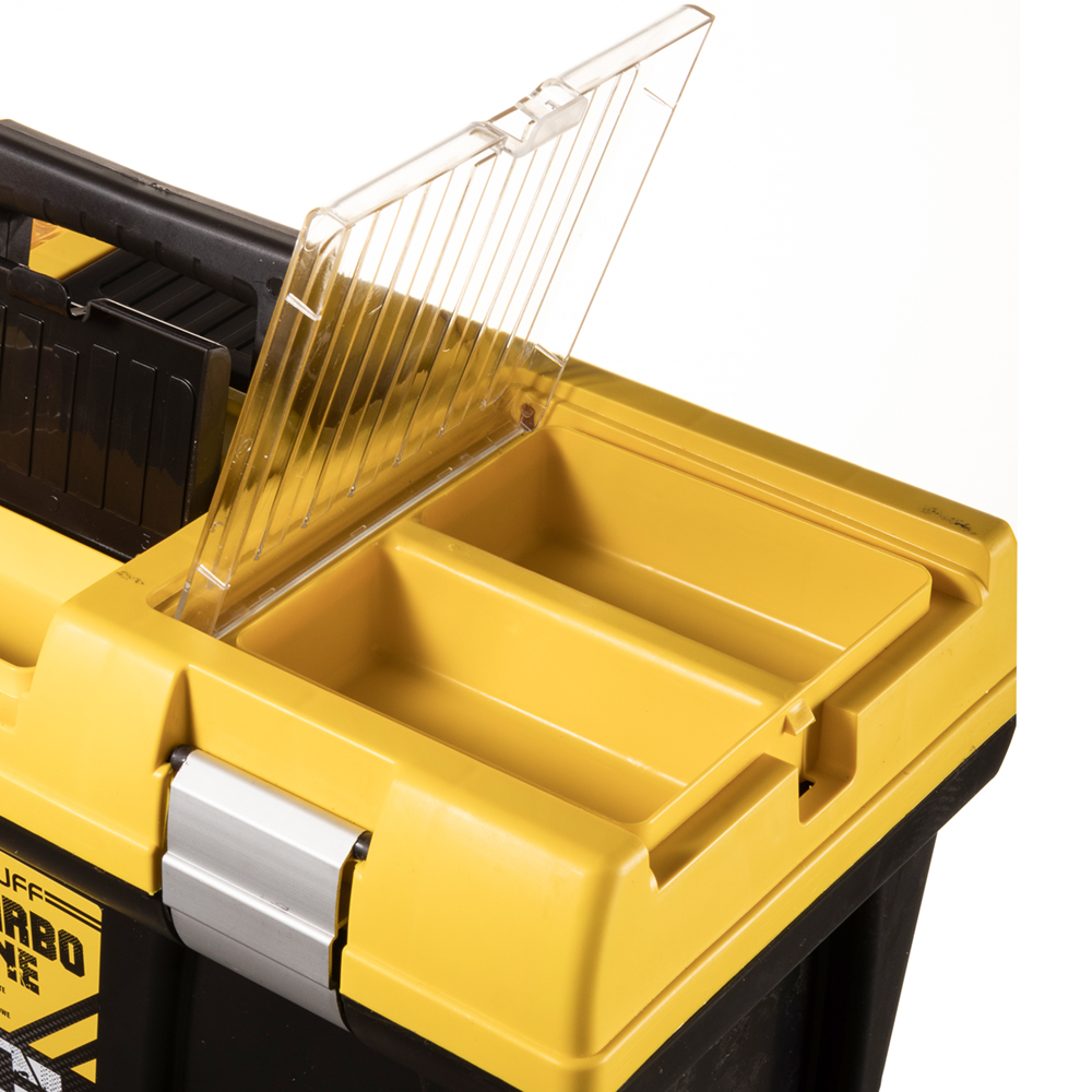 4 органайзера в крышке ящика (2с прозрачными поликарбонатными крышками и 2 с пластиковыми). В комплекте лоток для инструментов. Отверстие для навесного замка.
