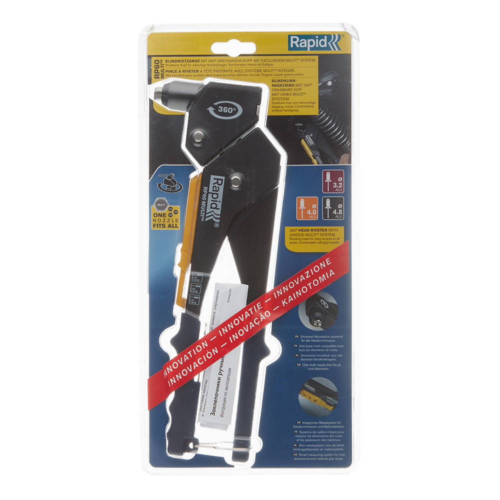 Применяется для создания неразъемных соединений из различных материалов. Благодаря уникальной многофункциональной насадке, механический заклепочник RP60 Multi может работать без смены насадок. Оснащен вращающейся на 360° головкой, что облегчает работу в ограниченных пространствах.